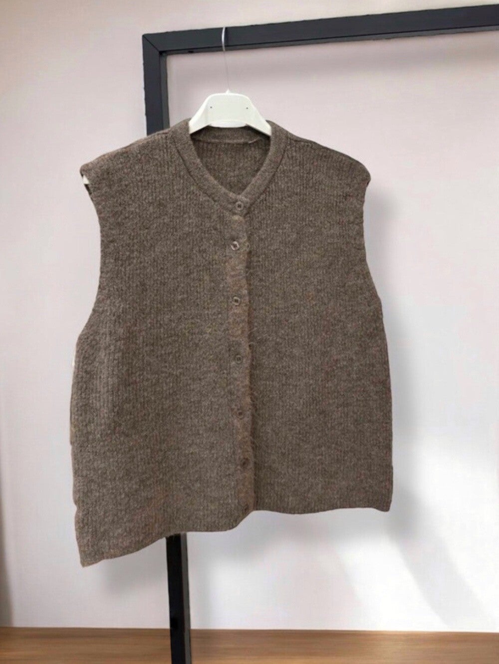 Dit gilet is een echte musthave voor het najaar, maar ook ideaal voor frisse lentedagen of koelere zomeravonden. De warme bruine tint voegt diepte toe aan elke look en laat zich prachtig combineren met neutrale kleuren zoals beige, crème of wit.