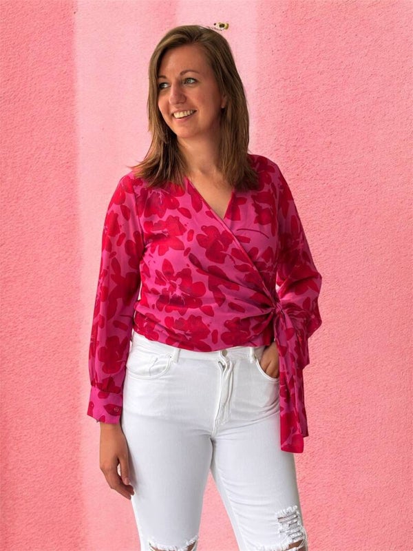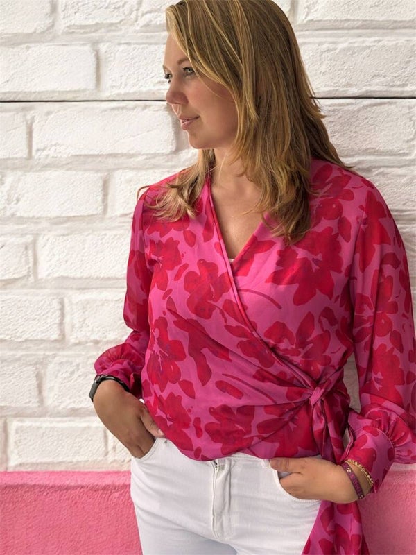 Deze overslag blouse is een echte must-have voor iedere vrouw die houdt van kleur en elegantie. De fuchsia tinten geven een frisse, krachtige uitstraling, terwijl de subtiele oranje accenten zorgen voor een speels detail. Dankzij het overslagmodel heeft de blouse een flatterende pasvorm die je figuur mooi benadrukt.