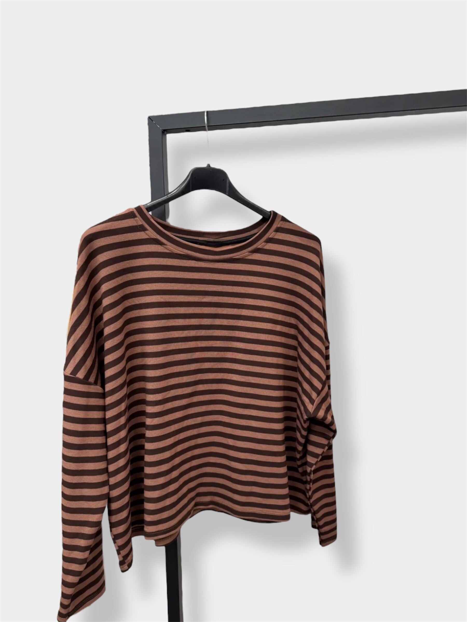 Een zachte, stijlvolle top met lange mouwen in warme bruintinten. De strepen geven een speelse, maar chique look. Comfortabel, makkelijk te combineren en perfect voor zowel casual als feestelijke momenten.