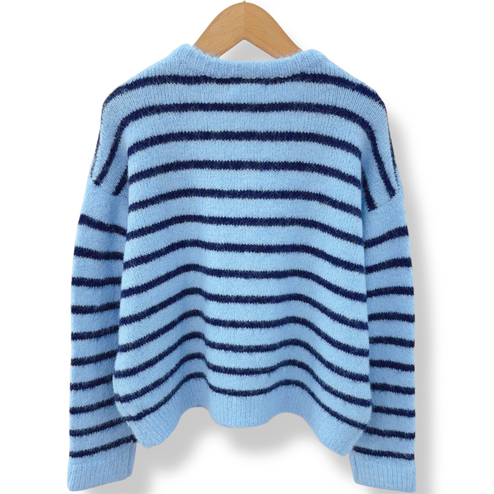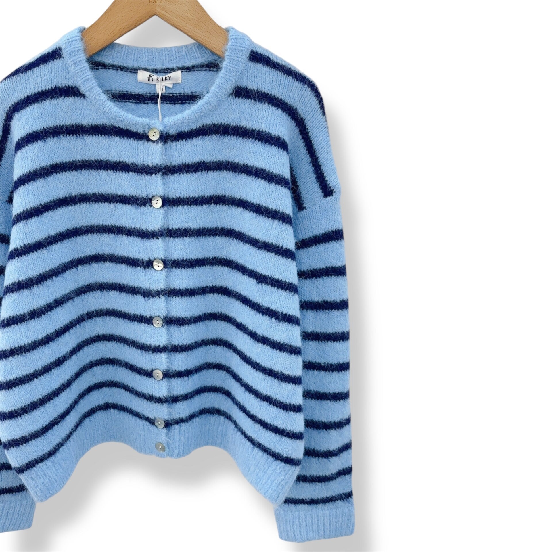 Combineer deze blauw gestreepte dames cardigan met een lichte jeans en witte top voor een frisse everyday look. Of draag ‘m over een jurk voor extra warmte en een speelse touch.