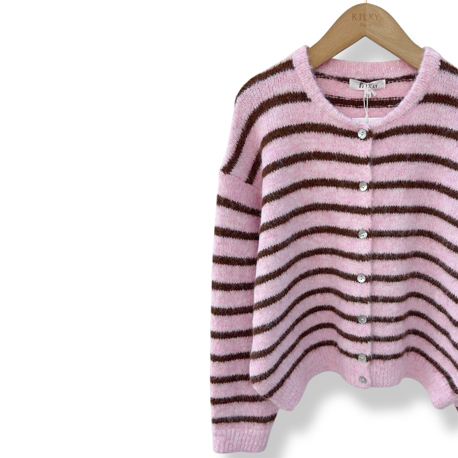 Combineer deze roze gestreepte dames cardigan met een lichte jeans en witte top voor een frisse everyday look. Of draag ‘m over een jurk voor extra warmte en een speelse touch.