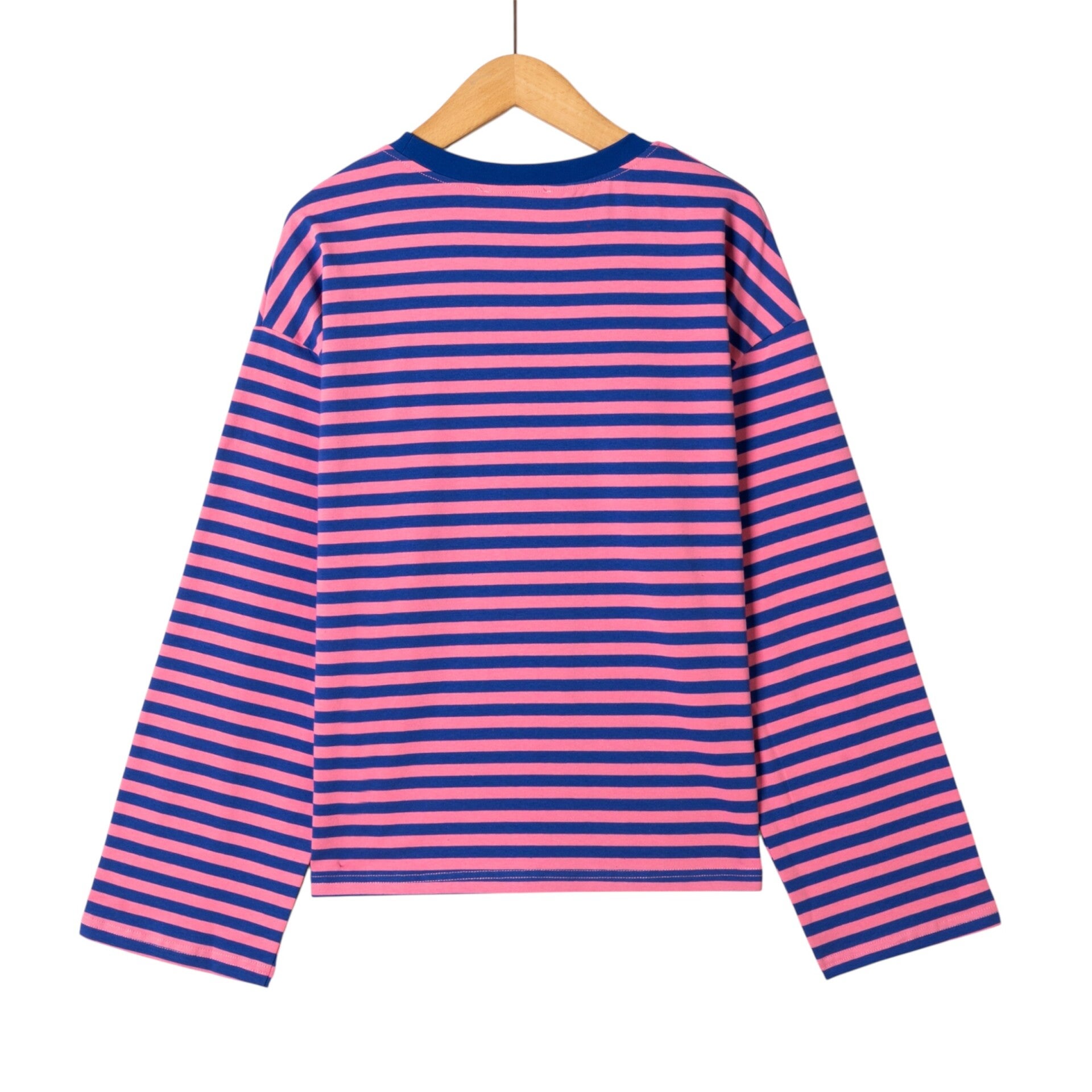 Op zoek naar een gestreepte top met lange mouwen in roze en blauw? Deze toffe kleurencombinatie geeft jouw outfit direct een speelse uitstraling. De zachte stof en comfortabele pasvorm maken deze top perfect voor elke dag, van een casual werkdag tot een ontspannen weekend.
